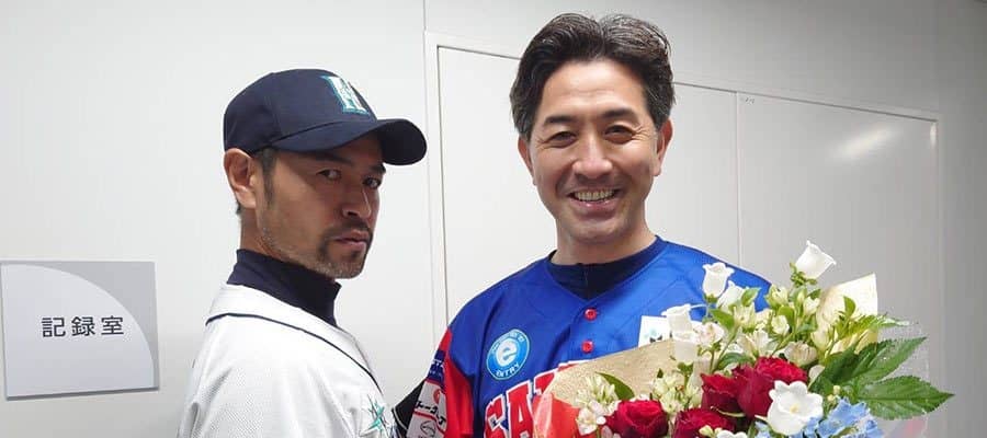 試合後にニッチローから花束を受け取ったG.G.佐藤(右)【写真:宮脇広久】