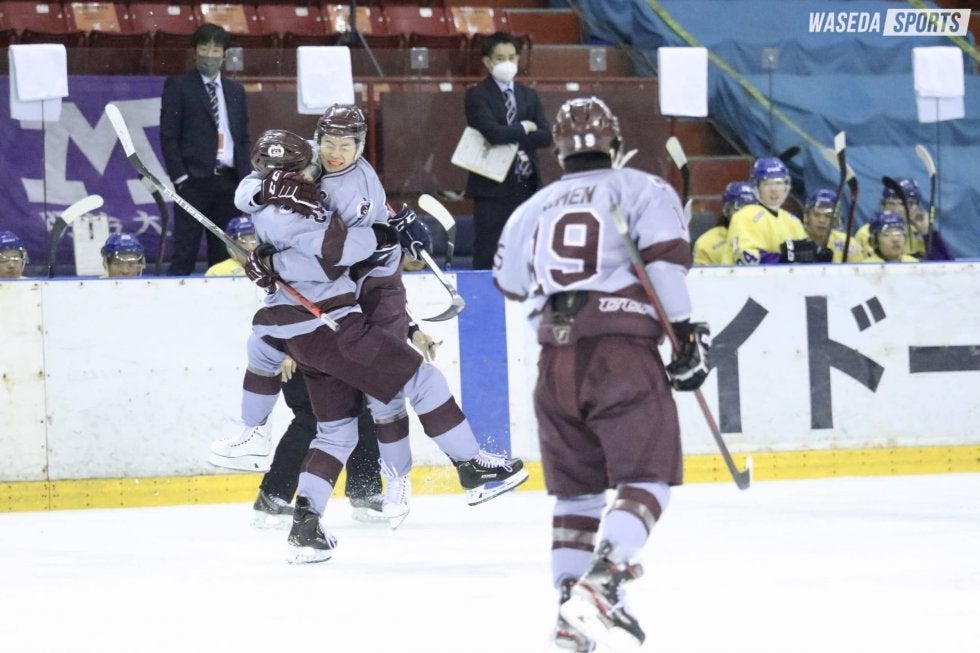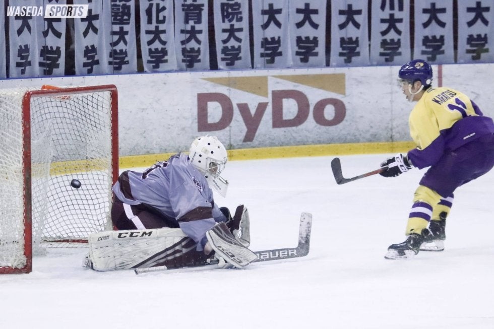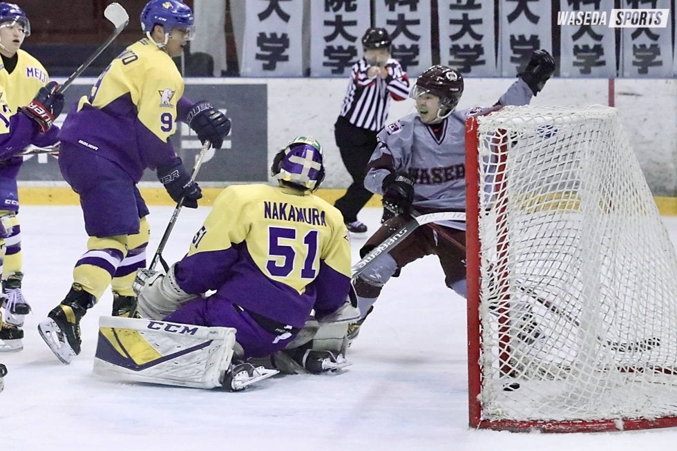互いを鼓舞しながら氷上へあがり、迎えた第3P。さらなる失点は避けたい早大だが、開始2分21秒、キルプレーの場面での明大の落ち着いた攻撃を守りきれず、パックがGK千葉の右側に滑り込む。2人差のパワープレーのチャンスは思うように攻められず、早大の反則も多くなる。互いに1人ずつペナルティを取られていた12分7秒、ディフェンスゾーンでのフェースオフを明大に取られ、そのままゴールを決められてしまった。その後のパワープレーのチャンスもペナルティによって打ち消してしまい、5点差で試合を終えた。