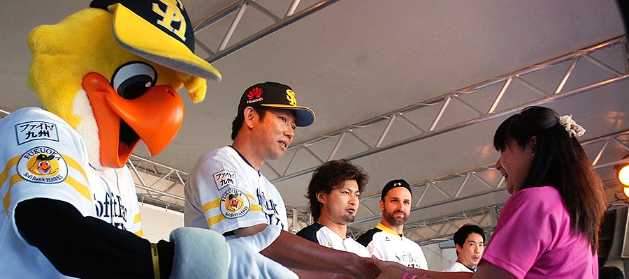 この日は、ヤフオクドームの外周コンコースにあるステージに鳥越裕介コーチ、五十嵐亮太、中田賢一、サファテ、森唯斗が登場。事前に申し込みした女性ファンにピンクリボングッズを手渡した。