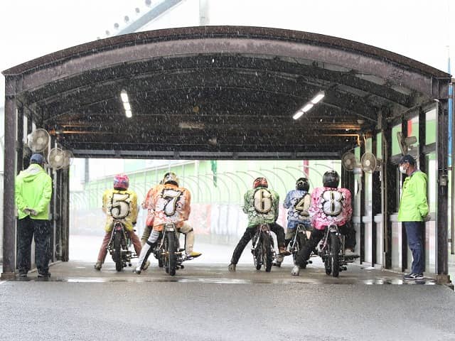 最終日は昼過ぎから雨が降り出して、5レースから湿走路に。優勝戦は加賀谷建明が試走一番時計の3.73で、丹村が3.74、さらに永井と鈴木が3.76で続く。オッズは地元の雨巧者の加賀谷と鈴木の折り返しが人気を集めていた。