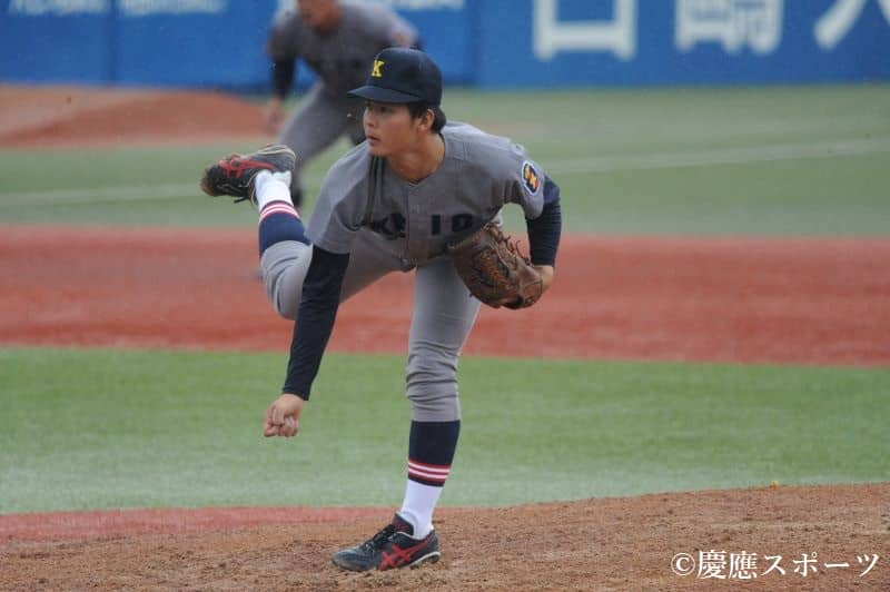2週続けて雨の中で熱投を見せた1-0で迎えた4回。先発の外丸は先頭打者に失策で出塁を許すと、打席には昨日の第1戦で慶大エース・増居翔太(総4・彦根東)から本塁打を放った今泉颯太(法3・中京大中京)。何としても抑えたいところだったが、適時右二塁打を打たれ同点とされる。しかし、5回からは今季リーグ戦初登板となった生井惇己(総4・慶應)が法大打線を抑える。6回には捕手・善波が盗塁を刺す好プレーを見せ、1-1と両者譲らない展開が続く。