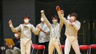<写真・勝利が決まり、喜ぶ選手たち> 5月5日、大山崎町体育館にて令和4年度関西学生フェンシングリーグ戦男女サーブル、…