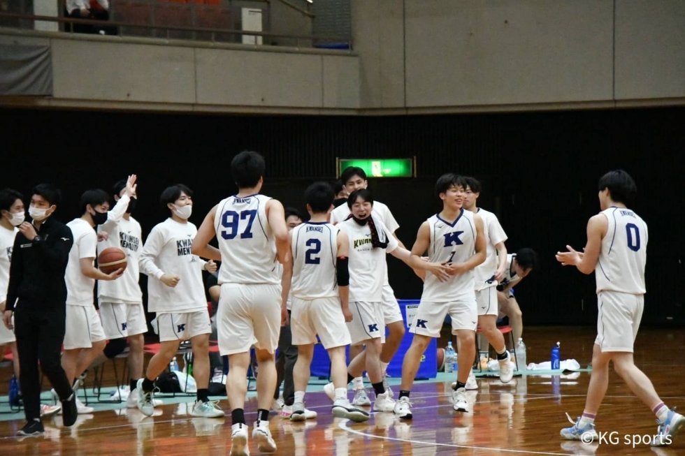 <写真・北橋の得点に喜ぶ選手たち>5月5日、エディオンアリーナ大阪にて第49回関西学生バスケットボール選手権大会が行われ…