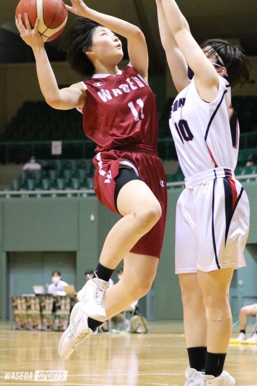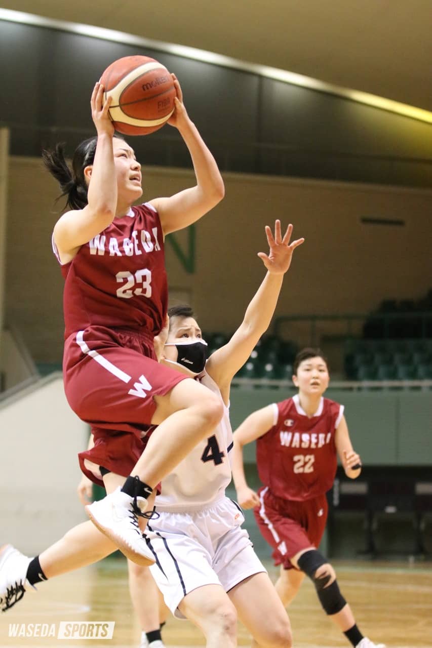 試合開始直後はC中野雛菜(スポ2=神奈川・東海大相模)の「逆ミスマッチだったので中のプレーを狙った」(中野)というオフェンスリバウンドや江村のバスケットカウントで9-2と点数を伸ばす。しかし、相手の3連続得点をきっかけに次々とスリーポイントやファウルからのフリースローを許してしまい、逆転された。しかし早大は「得点を取ることが自分の仕事」と語る江村が得点を奪い、なんとか食い下がる。25-26で第2Qに入ると、アグレッシブなプレーで連続得点をあげるものの、相手からの猛攻に遭い、すかさずタイムアウト。そこから約3分、両者ともに堅守が光り、こう着状態となる。均衡を破ったのはやはり江村。スティールからミドルシュートを沈めると、その後は中野やF佐藤実花(人1=岩手・盛岡白百合学園)の懸命なプレーで41-41と、同点で前半を折り返した。