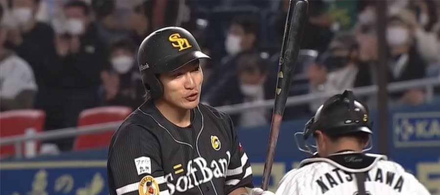 三振に倒れ苦笑いのソフトバンク・柳田悠岐【画像:パーソル パ・リーグTV】