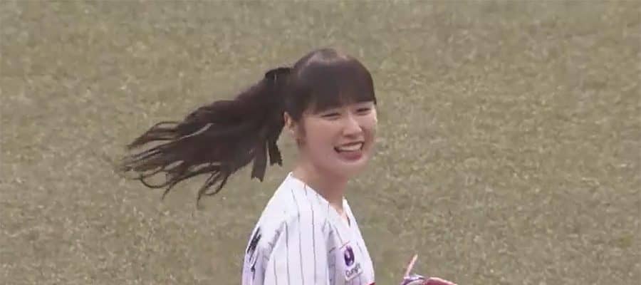 スカートひらり… 女優・大政絢さんが豪快投球でファン魅了「可愛すぎて」