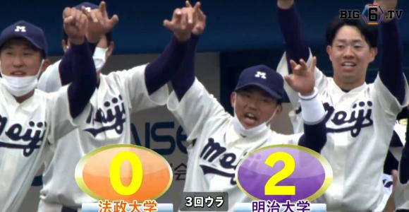 法政大学 0 - 2 明治大学勝: 蒔田稔 敗: 塙雄裕先制したのは明大。3回、満塁から上田希由翔(③愛産大三河)のタイ…