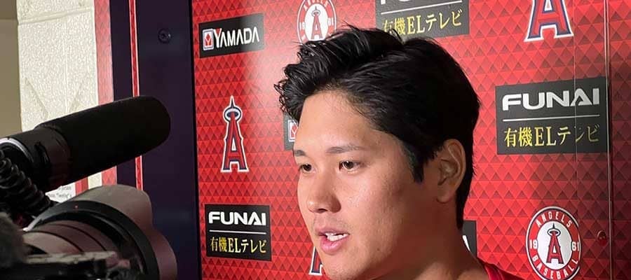 試合後に取材に応じたエンゼルス・大谷翔平【写真:盆子原浩二】