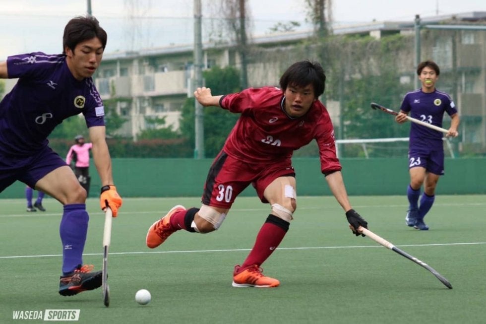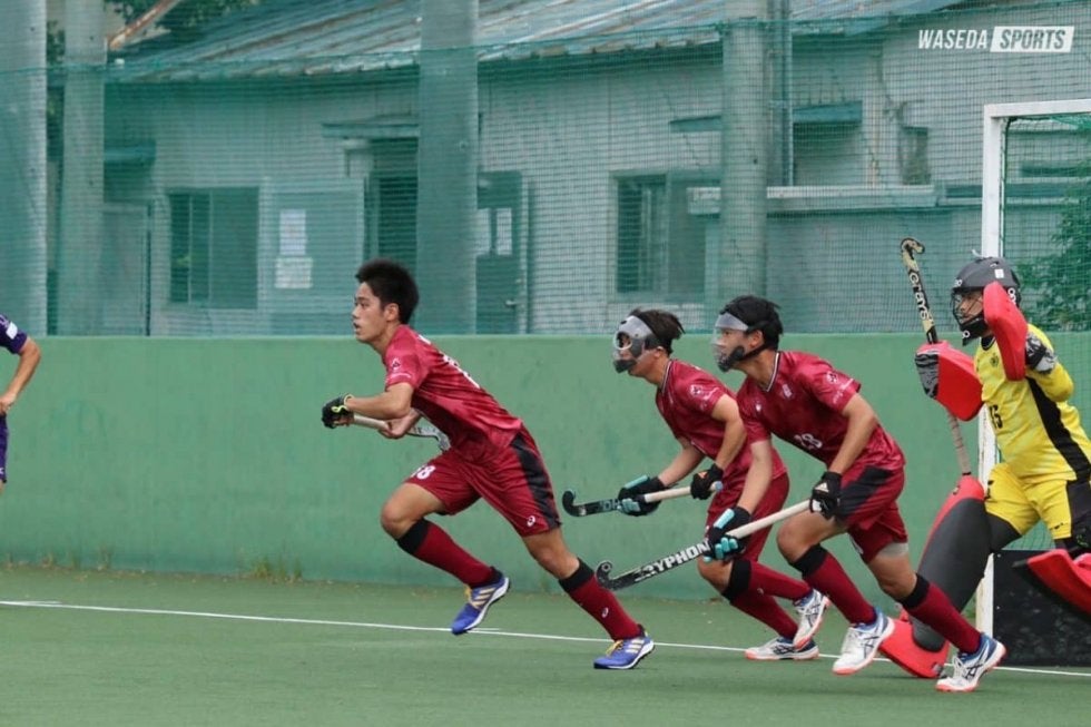 明大のセンターパスから試合が開始した。序盤から明大に攻め込まれる早大。主導権は常に明大に握られ、約6分、約14分と立て続けに明大にシュートを打たれるがGK林聖真(社3=東京・早大学院)の好セーブが続き早大も固い守備を見せた。約15分明大がPCを獲得し、フリックが決まり先制点となる。続く第2Qでも攻める明大、自陣で耐える早大の構図となった。約7分に早大がロングボールを狙うが明大の守備により阻まれ、カウンターを狙われて危うくなるが、粘り強い守備によって切り抜けた。ボールが早大陣地にある時間が長く続いたが全員で何とか守り切り前半が終了した。
