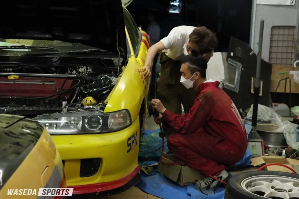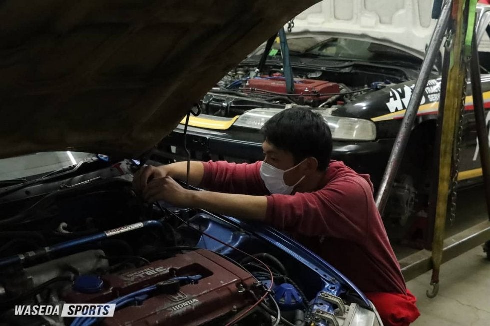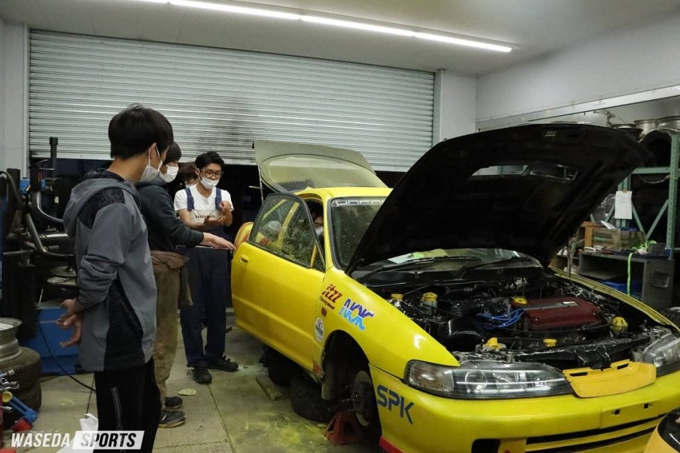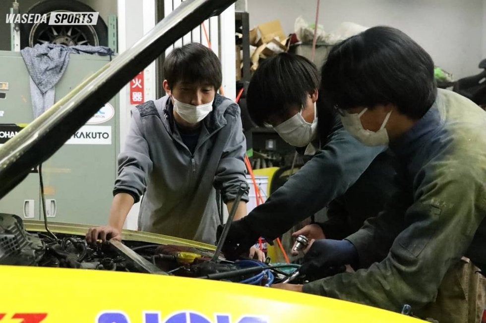 自動車部の活動場所は早稲田キャンパス29-6号館。早稲田駅から高田馬場駅方面に早稲田通りを歩いていくと、自動車部のガレージと部室はある。外では細かい雨が降りしきり気温が下がる中、自動車部のガレージは部員たちの熱気に包まれていた。17時半から始まった活動内容は、5日後に控えた全関東ジムカーナで使用する競技車両の整備と点検。神林崇亮主将(人4=埼玉・早大本庄)が中心となって、時には白熱した議論を重ねながら、着々と作業が進められていった。