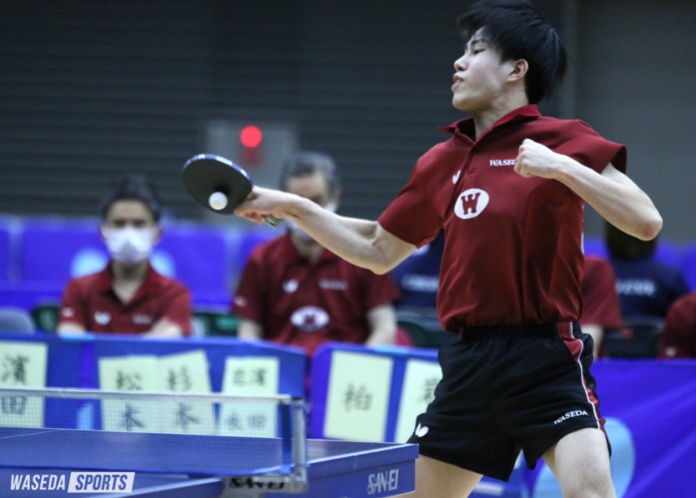 続く第4試合は法大との一戦。シングルスを1本ずつ取り合い、3番・杉本が相手エースと対戦した。2ゲームを先取された杉本だったが、そこから2ゲームを連取。ゲームカウント2-2で最終ゲームへと突入した。最終ゲームは中盤までリードを許す苦しい展開となる。それでも4-6とされた後、高速ラリーを連続で制し巻き返す。勢いそのままに8連続ポイントで、早大にとって大きな一勝をもたらした。