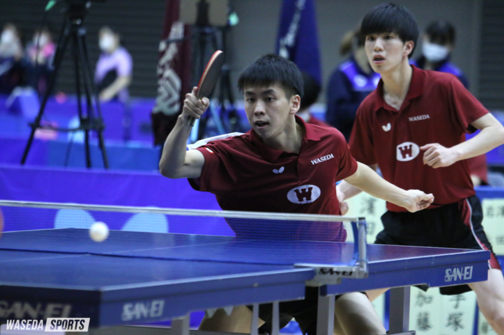 2勝1敗で迎えた岩永宜久主将(スポ4=福島・帝京安積)・浜田一輝(スポ1=愛知・愛工大名電)のダブルスも、ゲームカウント1-2と先行される。それでも第4ゲームは終盤までリードを保ち、ゲームポイントを握る。しかしそこから法大ペアが粘りを見せ、ゲームポイントをつかんでは相手に取られる展開が続く。1度はマッチポイントを奪われたが、浜田のサービスエースでしのぎ、続くラリーで4度目となるゲームポイントを握ると、ついに16-14で振り切った。第5ゲームも勢いそのままに得点を重ねて勝利。最後は5番を任された柏竹琉(スポ3=JOCエリートアカデミー)がストレート勝ちを収め、4勝1敗で法大を下した。