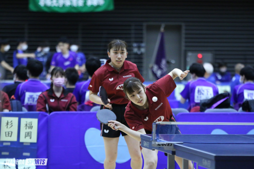 女子は3戦目となった東京富士大戦には4-2で勝利したものの、4戦目の日大戦では苦戦を強いられる。黒野葵衣主将(スポ4=東京・武蔵野)と里川奈優(スポ3=高知・明徳義塾)を投入しシングルスで先に2勝した早大。3番の顧琳婧(スポ2=愛知・桜丘)は敗れたものの、ダブルスではゲームカウント3-2と粘り勝ちを収め、勝利まであと1勝とした。