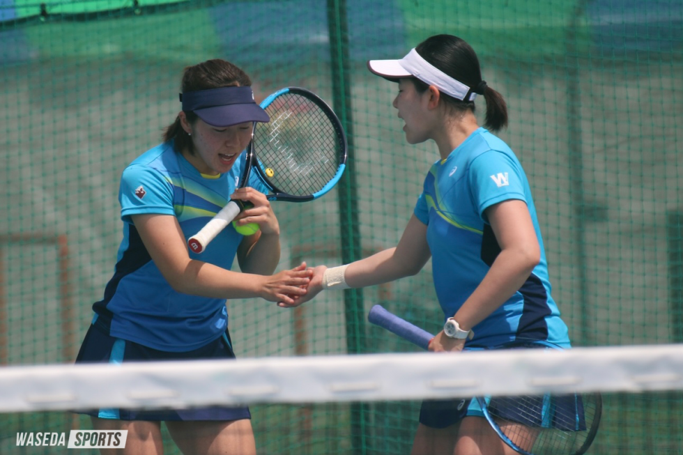 降雨の影響で順延となっていたダブルス1回戦には安藤優希(スポ4=東京・日出)・松田岬(スポ4=東京・淑徳)組が出場。第1セット序盤から相手にリードを許す苦しい展開となったが、「どんな時でも強気でいこうと話していた結果、最後の最後で取り切れた」(安藤)と話すように第1セットをものにする。第2セットでも調子は上向かなかったが、途中、安藤が松田に気合を入れてもらうように頼む場面も見られ、強気のテニスを貫き通した安藤・松田組が勝利を収めた。2回戦に臨んだ第1シードの吉岡・石川琴実(社4=神奈川・白鵬女子)組は圧倒的な強さで快勝。押川千夏(社4=福井・仁愛女子)・平田葵(スポ1=神奈川・白鳳女子)組は、第1、第2セットがタイブレークまでもつれ込む接戦となるが、一歩及ばず敗退した。