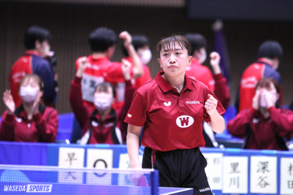 続くダブルスはストレート負けを喫し、2勝2敗とされる。5番に起用された里川奈優(スポ3=高知・明徳義塾)は、相手のエース出沢との対戦となった。1ゲームずつを取り合って迎えた第3ゲームは、序盤の5連続得点で流れをつかんだ里川が奪う。しかし第4ゲームを奪い返され、勝負は最終ゲームに持ち越された。その最終ゲーム、中盤までは食らい付いた里川だったが、相手の強打に押されミスが続く。徐々に点差を広げられ、最後はサーブレシーブがアウトになり試合終了。併行していた6番・深谷和花(スポ1=愛知みずほ大瑞穂)の試合は深谷がストレートで敗れていたため、結果2勝4敗で早大の敗戦が決まった。