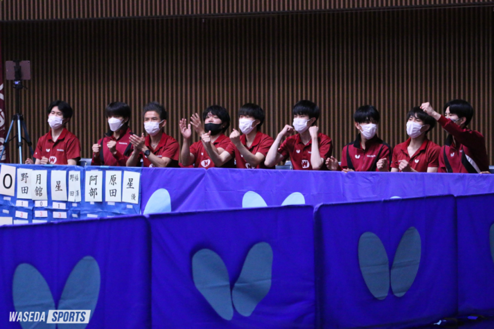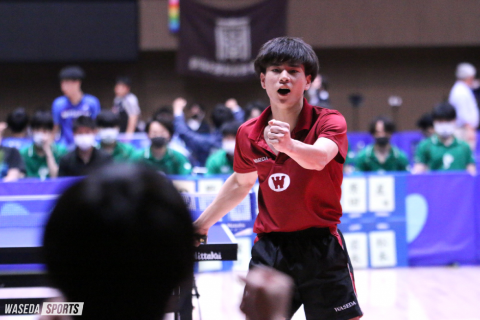 1番で登場したのは柏竹琉(スポ3=エリートアカデミー)。相手エースとの対戦となった柏は、第1ゲームを大差で落とすもその後2ゲームを連取する。ゲームカウント1-2とした第4ゲーム、相手にゲームポイントを奪われるが、そこから3連続得点で一気に逆転し12-10で勝利。幸先良い1勝に、ベンチも拍手で柏を迎え入れた。続く2番の浜田一輝(スポ1=愛知・愛工大名電)はデュースの末に第3ゲームを奪うなど、ストレート勝ちで早大を勢い付けた。