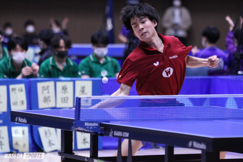 3番を任された荒井和也(スポ2=福岡・希望が丘)も、第1ゲームを先取する最高の立ち上がり。その後1ゲームずつを取り合い、ゲームカウント2-1で第4ゲームを迎えた。序盤は競った展開となり、点の取り合いが続く。それでも、相手の厳しいコースへの強打に対して荒井が粘りを見せると、徐々に試合は荒井のペースに。相手のミスが増え始め、荒井の攻撃が良く決まる。10-7でマッチポイントをつかむと、最後は相手のサービスに対しバックハンドで振り抜いた。相手は返球することができず、勝負あり。早大の勝利まで残り1勝とした。