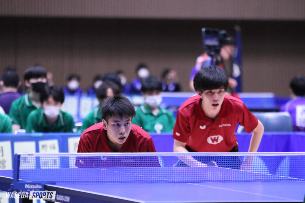 ダブルスでは、今大会負けなしの岩永宜久主将(スポ4=福島・帝京安積)・浜田組が出場。敗れたことのある相手に対し、「しっかり対策をした」(岩永)という早大ペア。序盤から主導権を握り、第1、第2ゲームを先取する。第3ゲームは一進一退の攻防が続くが、要所でサービスエースが飛び出すなど、最後まで流れを放さなかった。9-9から、岩永の3球目攻撃が決まりマッチポイントを奪う。最後はまたも浜田のサービスエースで11-9。勝利が決まると早大ベンチは喜びを爆発させた。