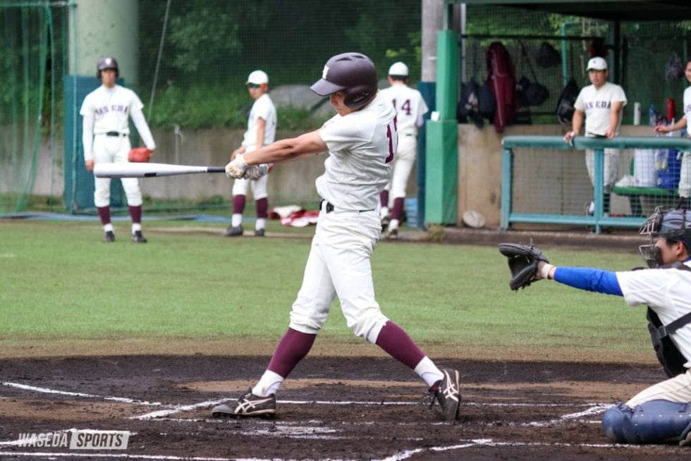 東京六大学春季リーグ戦(春季リーグ戦)も最終週を迎え、早大は東大と対戦した。法大戦で勝ち点を落とし、優勝こそ絶望的となった早大だが、1つでも上の順位を目指すため、何としても連勝で勝ち点を獲得したい。試合は序盤から早大のペースで進行した。早大は岡田和也(スポ2=東京・国学院久我山)の2点適時二塁打や新井健太主将(商4=東京・早大学院)の3ランで2回までに5点のリードを奪うと、中盤以降も得点を重ねてコールド勝ち。勝ち点獲得に向け、まずは初戦をモノにした。