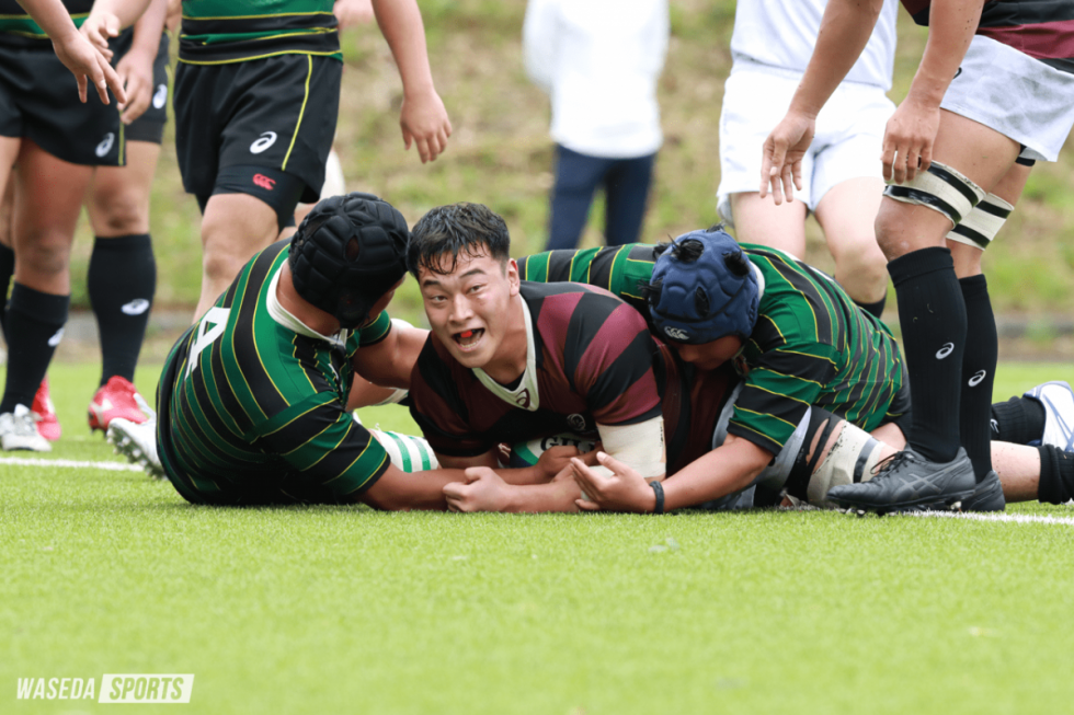 試合は開始早々から動く。2分、敵陣22メートル内でのラインオフサイドを起点に、インゴールから5メートル付近でラインアウトを獲得。そのラインアウトからモールを組んだ早大は、岡村がインゴールに飛び込みトライ。幸先よく先制に成功する。9分にもラインアウトモールから岡村がグラウンディングし、得点を重ねた。しかし11分、ノックオンから自陣22メートル内でスクラムを与えた早大は、相手FWにゴールラインまで押し込まれ、ピンチを迎える。だが、トライ寸前で相手のノックオンを誘い、自陣を脱出。大きなピンチはこのシーンのみで、その後もトライを量産していく。30分には敵陣5メートルでのラインアウトを起点に、最後は大外で待っていたロック江島航(法4=早稲田渋谷シンガポール)がインゴールに飛び込むなど、前半を34ー0で折り返した。