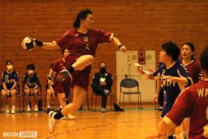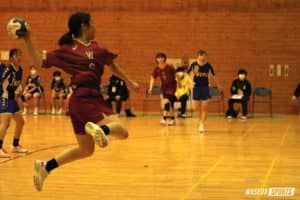 日女体大ボールで試合が始まった。開始直後、相手のシュートをGK江連織圭主将(スポ4=千葉・昭和学院)が間一髪で防ぐと、早大は果敢に攻め入る。しかし、両者シュートを決め切れず、スローペースで試合は進んでいく。開始2分半、速攻で先制点を許すと、再び速攻かという場面、CB村上楓副将(スポ3=福岡・明光学園)のパスカットが光る。村上副将が中央からシュートを沈め、待望の初得点。ここから得点を重ねたい早大だが、むしろ相手に連続得点を許し、点差は3点に。慌ててタイムアウトを要求すると、ここで試合の流れが変わる。LB浦野詩織(スポ3=愛知・旭丘)がシュートをねじ込むと、速攻やサイドシュートも決まり、試合を振り出しに戻す。その後は互角の攻防が続くが、前半残り5分、PV杉浦亜優(スポ1=愛知・名経大市邨)のポストシュートでついに逆転。8-7で前半を終えた。