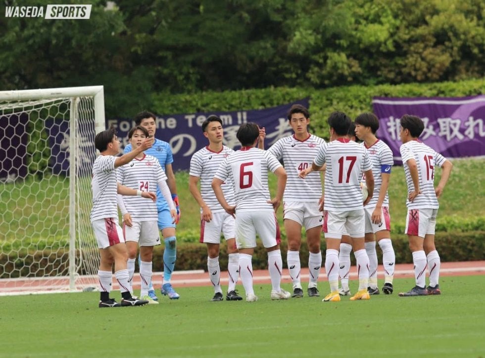「(前節で)東京国際大相手に突きつけられた自分たちの弱さの部分と向き合って、謙虚に一つ一つのプレーを着実に、かつチームとして生み出すということを意識してゲームに入った」と外池大亮監督(平9社卒=東京・早実)。前半最初のチャンスを迎えたのは早大だった。7分、MF水野雄太(スポ4=熊本・大津)のスルーパスに反応したFW駒沢直哉(スポ2=ツエーゲン金沢U18)がシュートを放つも、これは惜しくも枠の左へ。その直後にはDF鈴木俊也(商4=東京・早実)のロングフィードから抜け出したMF安斎颯馬(社2=青森山田)がゴールを狙ったが、これは相手GKの好守に阻まれた。開始早々から仕掛けた早大であったが、その後は一転して明大にペースを握られ、攻撃を展開できない苦しい時間帯が続く。17分には自陣でのコーナーキックの混戦から相手にシュートを打たれるも、これはポストに救われた。その後も明大に再三決定機を作られたが、GKヒル袈依廉(スポ2=鹿児島城西)がファインセーブを連発したほか、守備陣も集中した守りを見せ、これをしのいでいく。結局両チームとも決めきることができず、スコアレスで折り返した。