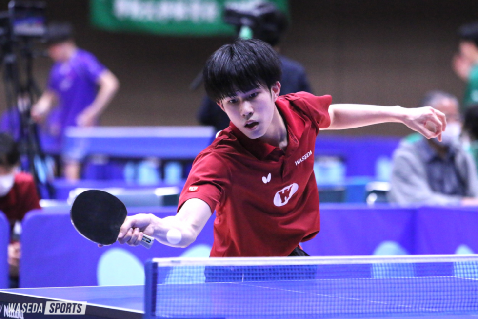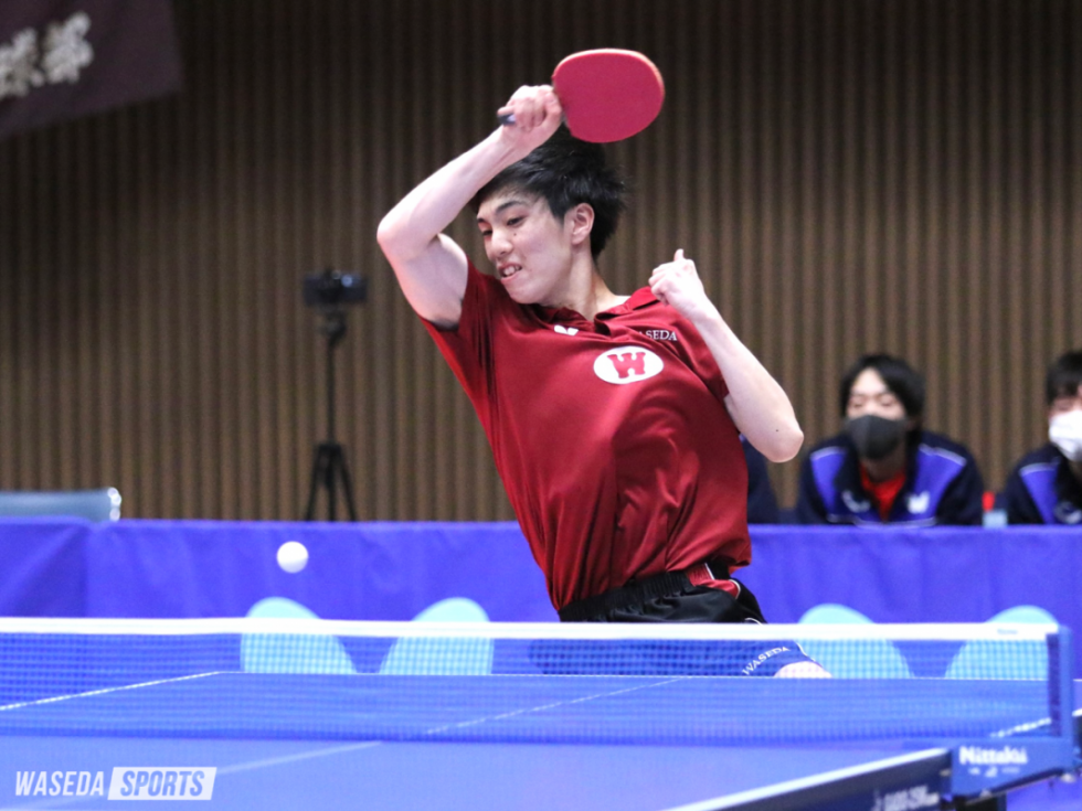 早大の1番手には松本累(商4=東京・早実)が登場。勝ってチームを勢いづけたい松本だったが、試合は終始相手のペースで進む。第3ゲームは連続でサービスエースを奪いデュースに持ち込んだが、相手の高い技術の前にストレートで屈した。2番を任された浜田一輝(スポ1=愛知・愛工大名電)は、1ゲームずつを取り合って迎えた第3ゲーム、4点差でゲームポイントを握ってから6連続得点を許し、このゲームを失う。さらに第4ゲームでも10-6としてから6連続失点。あと1点が遠く、マッチカウント1-3で敗れた。続く3番の杉本和也(スポ3=福岡・希望が丘)は、相手のサービスに苦しむ場面も見られたが、攻撃力を生かして相手を突き放す。最後は苦戦した相手のサービスに対して2球目攻撃を決め、ストレートで勝利。1勝2敗でダブルスにつないだ。