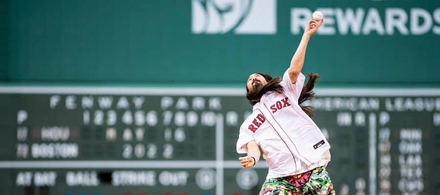 これは16日(日本時間17日)にボストン・フェンウェイパークで行われたレッドソックスとアストロズの試合でのこと。始球式のマウンドに上がったのは世界的DJのスティーブ・アオキ氏。意外な? 強肩を披露して、左腕からの投球は捕手のはるか後方まで飛んでいった。