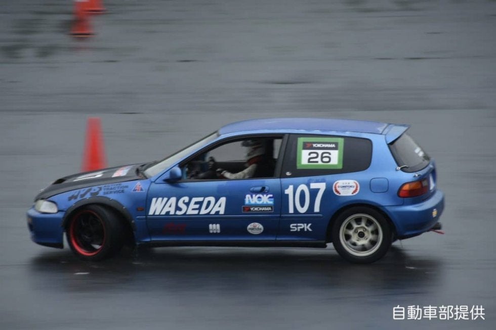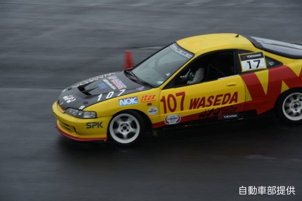 前日から激しい雨が降り続いた影響で、ウェットな路面となりコンディションが悪くなる中、静岡・富士スピードウェイで全関東学生ジムカーナ選手権(全関東ジムカーナ)が開催された。今年は3年ぶりに入場規制が解除され、早大応援部も富士スピードウェイに駆けつけ、自動車部に熱い声援を届けた。早大自動車部からは最上佳樹(社4=東京・攻玉社)、近藤怜(先理3=岐阜)、石山萌乃(文構3=神奈川・日女大付)、小林眞緒(創理3=福岡雙葉)、大矢根洋(文2=東京・和光)の5名が出場。走行開始時に雨は止んだが、コースが短くタイム差が出にくい状況の中、男子は団体5位、女子は団体優勝を果たした。