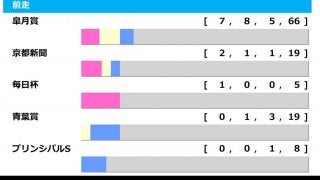 皐月賞 【7-8-5-66】 勝率8.1%、連対率17.4%、複勝率23.3% 京都新聞 【2-1-1-19】 勝率8.7%、連対率13.0%、複勝率17.4% 毎日杯 【1-0-0-5】 勝率16.7%、連対率16.7%、複勝率16.7% 青葉賞 【0-1-3-19】 勝率0.0%、連対率4.3%、複勝率17.4% プリンシパルS 【0-0-1-8】 勝率0.0%、連対率0.0%、複勝率17.8%