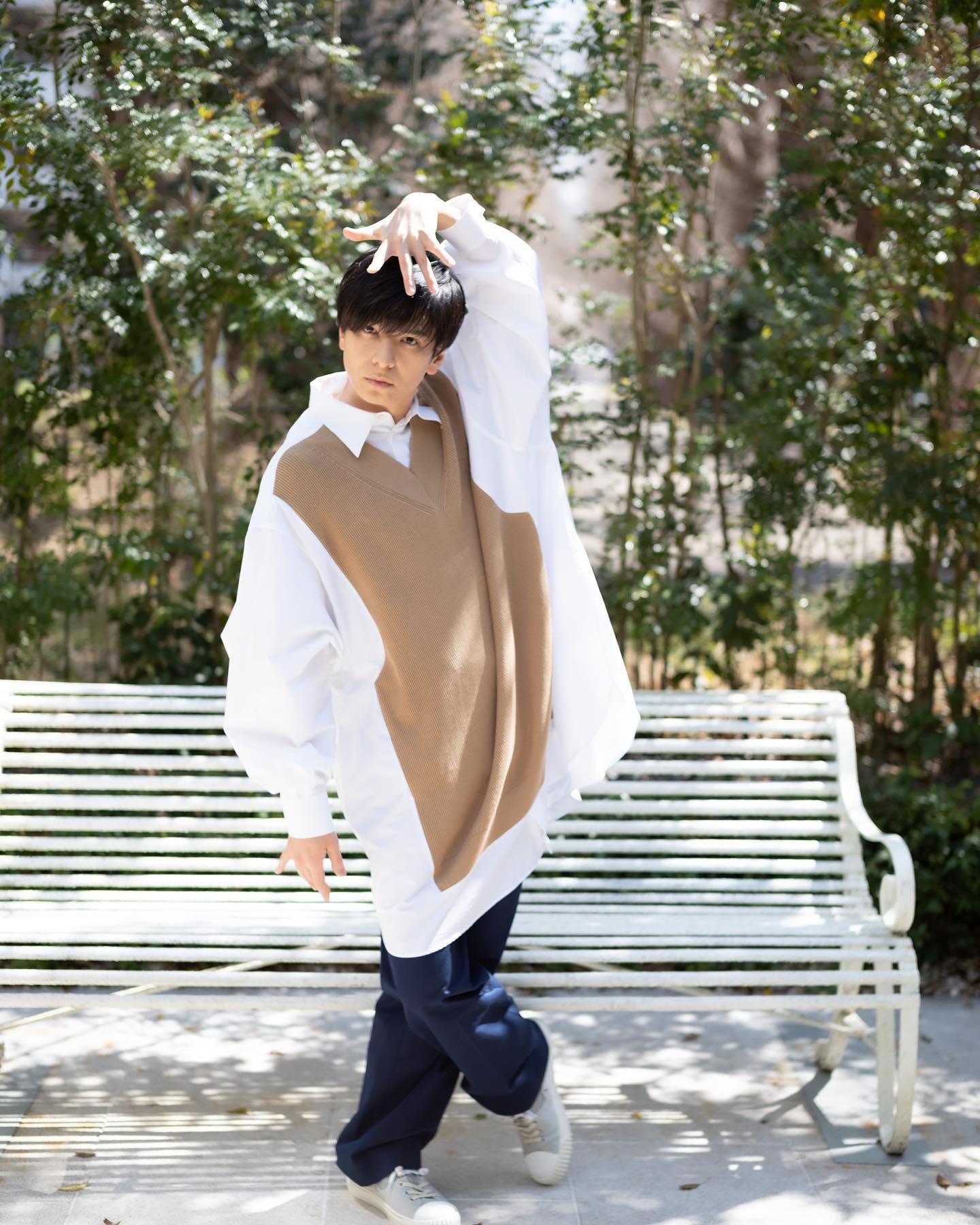 「おばんです」と綴り、2枚の写真をアップ。超オーバーサイズのシャツに身を包み、ラフなポージングをとるオフショットを披露した。普段とは違った前髪を下ろしたヘアスタイルが印象的だ。