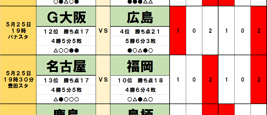 今回のtotoではJ1第15節の9試合とJ2第18節の4試合が対象となっている。過去のデータや直近の様子などから、分析…
