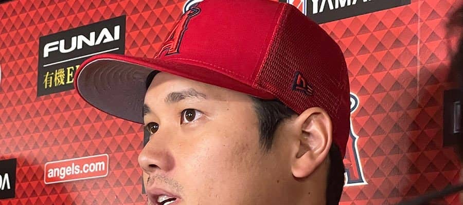 試合後の取材に応じたエンゼルス・大谷翔平【写真:盆子原浩二】