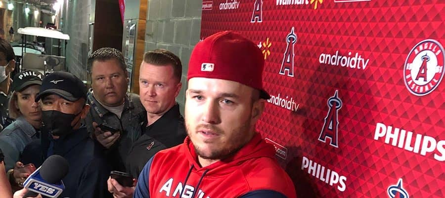 試合前の取材に応じたエンゼルスのマイク・トラウト【写真:木崎英夫】