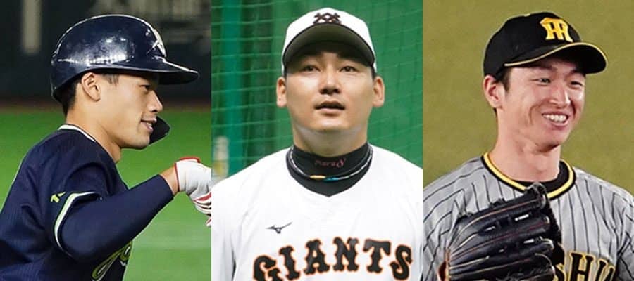 ヤクルト・塩見泰隆、巨人・丸佳浩、阪神・近本光司(左から)【写真:荒川祐史】