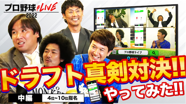 プロ野球OB&野球好きゲストが集まりプロ野球#LIVE2022「ドラフト会議バトル」をプレイ!!実際のドラフト会議同様に競合、抽選がゲームを通して繰り広げられ、