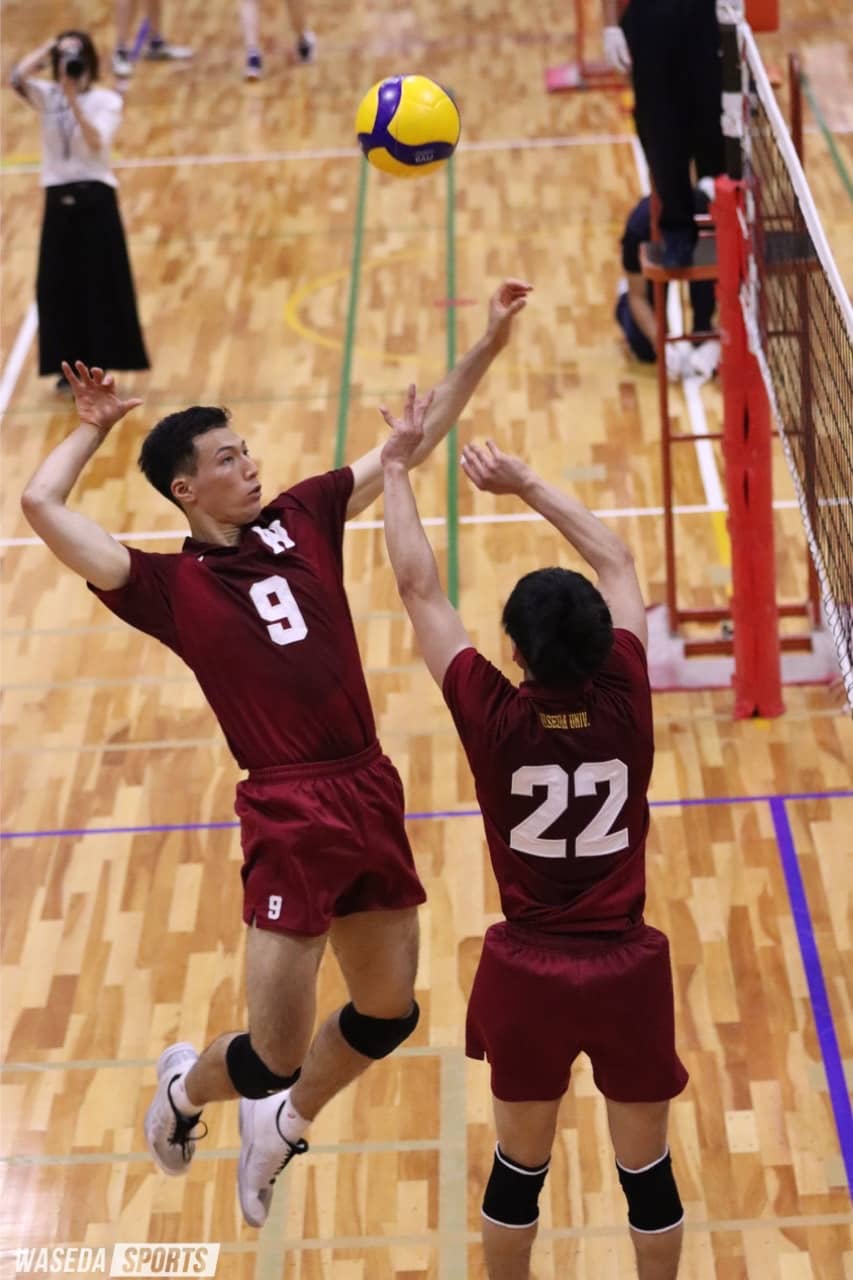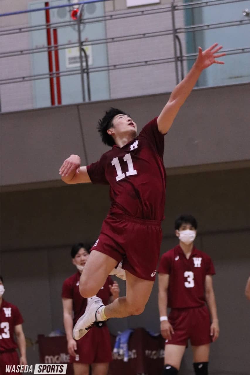 第2セットは開始から競り合いとなる。パイプ攻撃で水町が得点するが、相手も安定したサーブレシーブから速い攻撃を展開。両者ともに一歩も譲らない。7ー8と早大が追いかけるかたちとなったが、ここで重藤トビアス赳(スポ4=神奈川・荏田)がスパイクとサービスエースを決め、9ー8とブレイクに成功する。そして再びサーブ権が移動する接戦に。ここで荒尾怜音(スポ3=熊本・鎮西)が、ここまで苦しめられた速いテンポのクイックをレシーブし、山田大貴(スポ3=静岡・清水桜が丘)が決めた。これがブレイクポイントとなり、13ー11と点差を広げた。中盤にも伊藤吏玖(スポ3=東京・駿台学園)が強烈なクイックをレシーブするファインプレーをみせ、徐々に点差をつける。最後は山田がスパイクを決め、25ー21でセットを取り返し、試合を振り出しに戻した。
