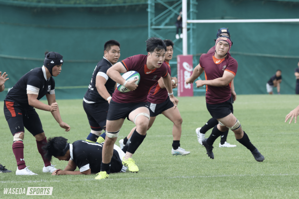 晴天が広がり、汗ばむ暑さの中で早大DEチームは上智大との一戦に臨んだ。前半開始早々、モールで押し切り先制トライを挙げるが、相次ぐミスにより守りの時間帯が続く。中盤には追い上げを見せるものの、22ー24の2点ビハインドで試合を折り返した。後半戦は、前半で出た課題を修正し、攻勢に転じる。WTB清透馬(商2=茨城・茗渓学園)のトライを皮切りに連続して得点を重ね、徐々に相手を突き放した。最終スコアは46ー29、価値ある一勝を挙げた。