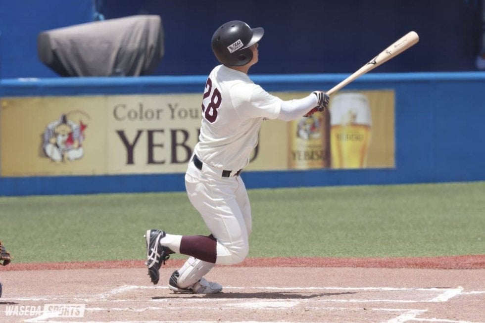 早大・鹿田、立大・吉野の両先発の踏ん張り合いが続いていた5回、早大打線は6番・小沢周平(スポ1=群馬・高崎健康福祉大高崎)が左翼手の頭上を越える二塁打で出塁する。続く田中翔太郎(教2=埼玉・春日部共栄)の犠打が野手選択を誘い、無死一、三塁の好機を作る。1死後、栗田が左翼に打ち上げた打球は飛距離十分の犠飛となり、小沢が生還。さらに1番・中村敢が右前に適時打を放ち、早大はこの回2点の先制に成功する。そして7回、1死から田中翔が安打で出塁すると、続く中野翔斗(人2=長野・佐久長聖)は倒れるも、栗田の自身神宮初本塁打となる左越え本塁打で2点を加えて終盤を迎えた。