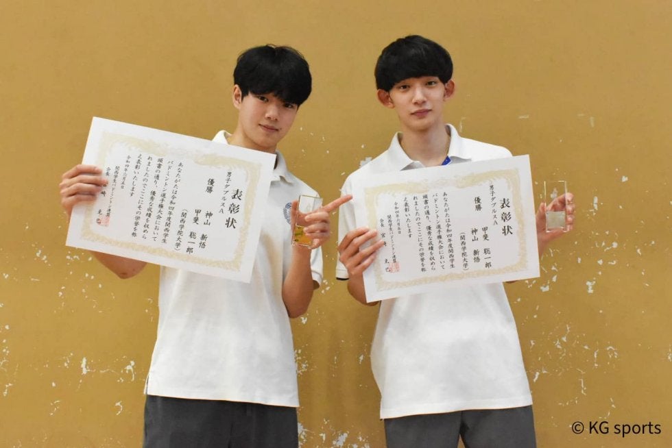 <写真・賞状を手に写真撮影に応じる甲斐聡・神山ペア> 6月5日、龍谷大学深草キャンパス体育館にて、令和4年度関西学生バ…