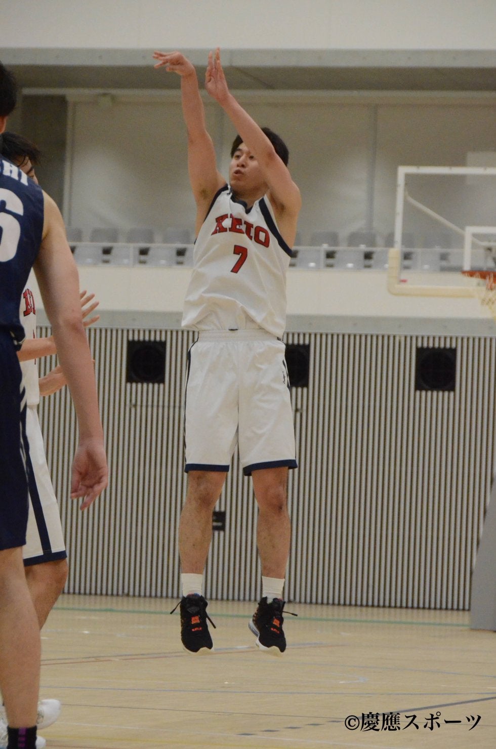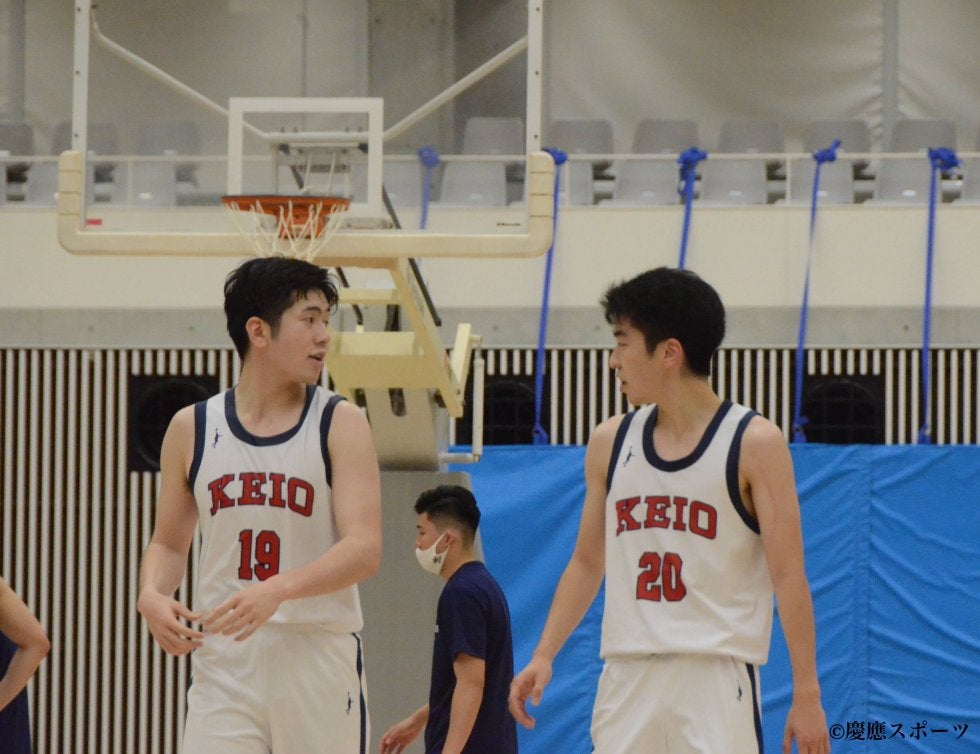 今後の活躍にも期待がかかる椎橋(左)と廣政(右)リードを広げたい第2Q、山本のミドルシュートで試合が再開。その後連続得点を許すも、藤島のパスカットから速攻でのシュートを確実に決め、流れを引き戻す。しかし、その後はゴールに嫌われる時間が続き点を伸ばすことができない。山下、髙島がリバウンド争いで体を張ったプレーを見せ、粘り強く攻め続けると、水谷の3ポイントがリングを捉える。それに続くように廣政も2本連続で3ポイントを沈める。椎橋遼生(政1・國學院久我山)もリバウントからそのままボールを押し込み得点。相手の反撃をかわした慶大は、43−25で前半を終えた。