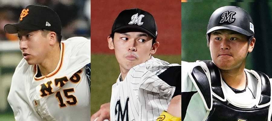 巨人・大勢(左)、ロッテ・佐々木朗希(中)、ロッテ・松川虎生【写真:荒川祐史】