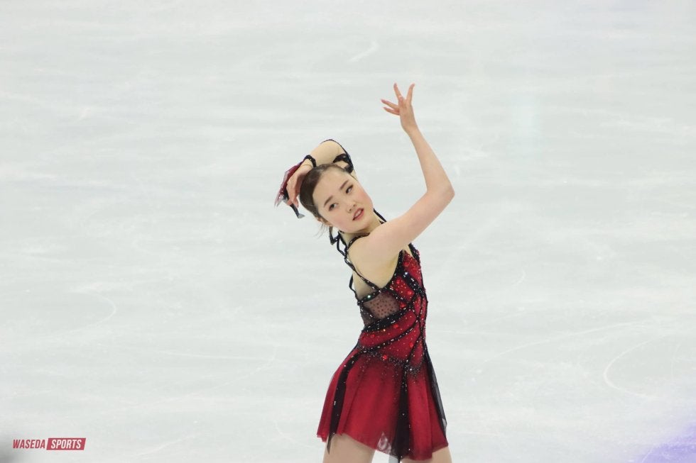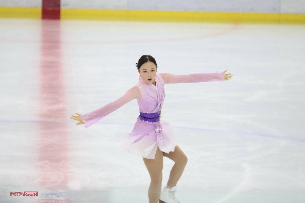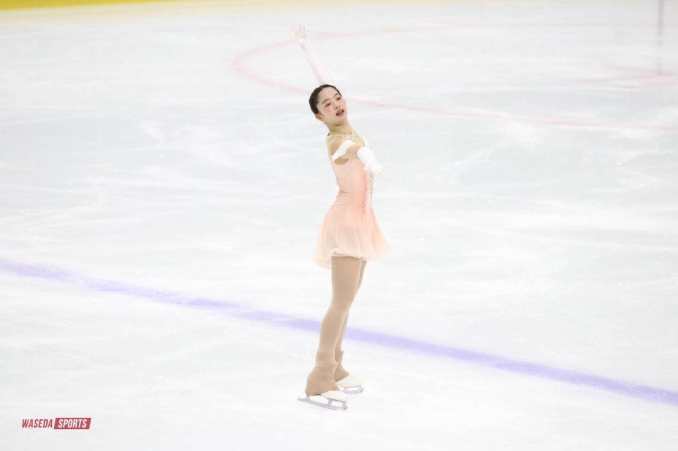 「すごく緊張してしまった」と語ったように、少し表情が硬かった。冒頭、2回転の単独ジャンプを両腕を上げて跳ぶと、綺麗に着氷。良いスタートを切ったかと思われたが、続く2回転アクセルでは転倒。その後も果敢にジャンプに挑戦していくものの、ミスを連発してしまう。それでも、曲調が変化する後半ではスピードを生かした滑りを見せる。『Beethoven's 5 Secrets』の壮大な雰囲気を全身で表現し、大学デビュー戦を終えた。ジャンプのミスが響き、得点は39・12点、順位は31位。本来の力を出すことはできなかったものの、「次につなげるため、何を頑張ればいいのかが明確になった」という、収穫が多い大会となった。早大スケート部の新入生の今後に期待が高まる。