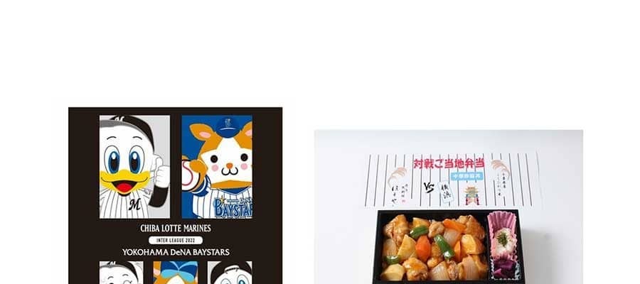 ロッテはDeNA戦限定グルメの中華酢豚丼(右)や両球団マスコットコラボグッズなどを販売【写真:球団提供】