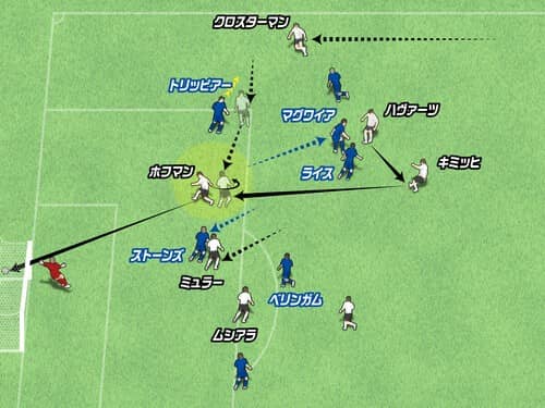 ハヴァーツは隣のキミッヒへ渡し、そこからフリーのホフマンへ縦パスを入れてゴール