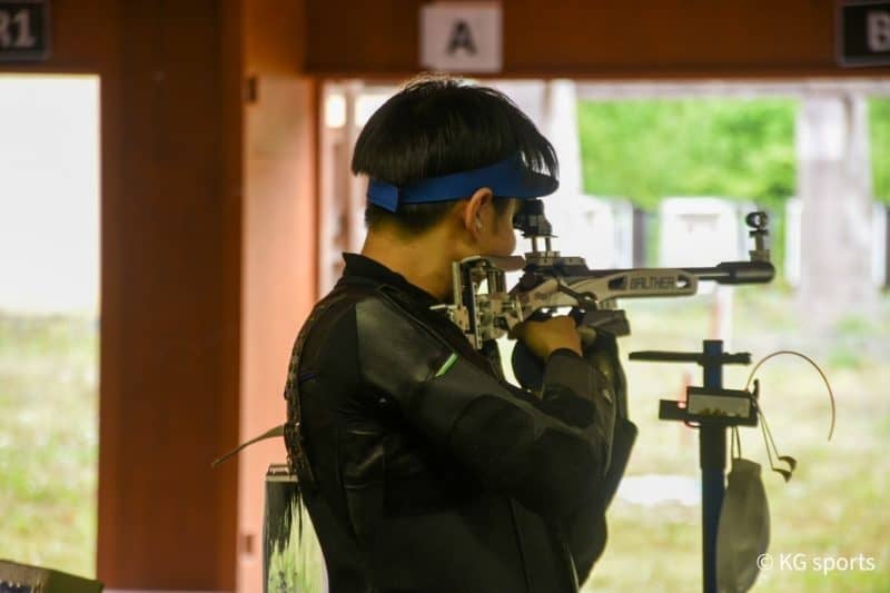 <写真・的を狙う寺田>6月11日、能勢町ライフル射撃場にて、2022年度西日本学生スポーツ射撃選手権大会及び、第33回西…