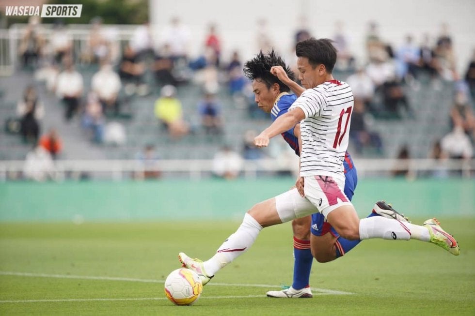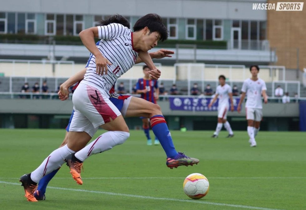 「出し惜しみをしていたら自滅していってしまうと思ったので前半から全力でいきました」(外池監督)と言うように前半は立ち上がりから主導権を握る。開始2分、MF小倉陽太(スポ3=横浜FCユース)からロングパスを受け取ったDF森璃太(スポ3=川崎フロンターレU18)がワンタッチでMF安斎颯馬(社2=青森山田)にクロスを供給するも、シュートは枠の外へ。先制点を奪いたい早大は9分、森のコーナーキックにFW奥田陽琉(スポ3=柏レイソルU18)がヘディングをするも止められる。しかしそのこぼれ球を平松が詰めゴールネットを揺らした。先制点獲得後しばらくは順大がボールを回す展開が続くも、徹底した守備で相手にチャンスを作らせない。24分、DF鈴木俊也副将(商4=東京・早実)のコーナーキックを相手GKが弾いたボールに小倉が反応するものの枠を捉えきれない。その後、順大に自陣へ攻め込まれるが早大は落ち着いたプレーでリードを守り抜く。お互い決定機を作れないまま1ー0で前半を終えた。
