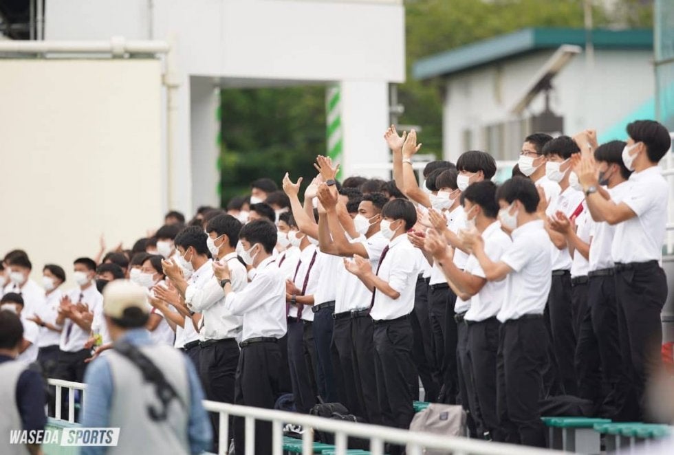 ピッチに向けて拍手を送り、勝利を祝う部員たち
