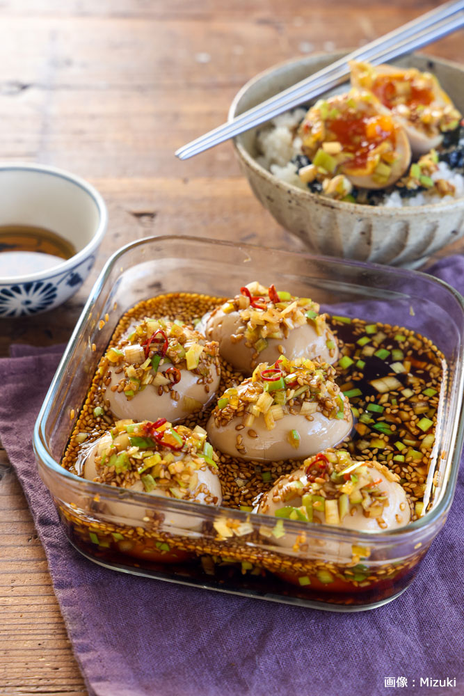 2位は、「麻薬たまご」。これは、保存容器に刻んだ長ねぎやにんにく、唐辛子などの調味料を入れ、半熟卵を漬けた韓国発の味付け卵のこと。おいしくて中毒性があるという意味から「麻薬」というネーミングになりましたが、過激なワードに配慮して「合法卵」「〇〇風味付け卵」などといったネーミングでも投稿されています。