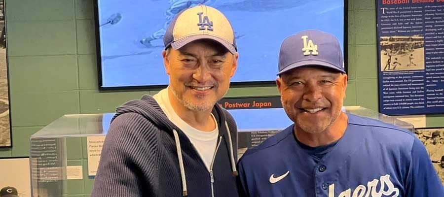 ドジャー・スタジアムを訪れた俳優の渡辺謙さん(左)とドジャースのデーブ・ロバーツ監督【写真:盆子原浩二】